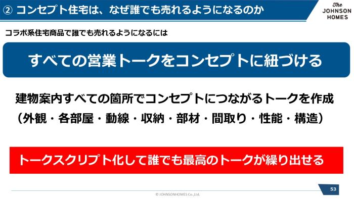 この高い契約率の秘密は、「商品コンセプト」と「営業トーク」を明確につなげていること。外観、素材、間取り、性能など、建物の各ポイントを説明する際、すべてのトークが自然に『コンセプト』へ結びつくように設計されています。